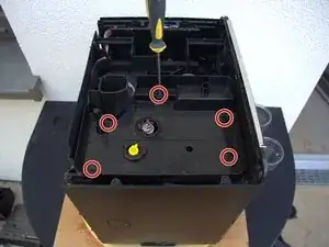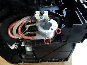 Держатель нагревателя жидкости крепится тремя винтами Torx T10. (Третий скрыт под нагревателем). Удалите их.