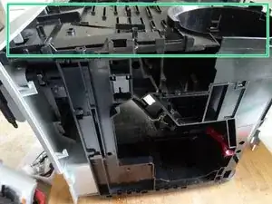 Снимите боковую панель над заварочным блоком так же, как в предыдущих шагах. (На фото также сняты верхняя крышка и контейнер для зерен. Это не обязательно).