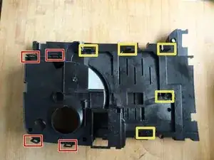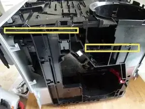 (Опять же, для лучшей видимости крышка и контейнер для зерен сняты). Вставьте монтажный инструмент в зазор между верхней частью и остальной частью аппарата, освободите защёлки и выступы, пока верхнюю часть можно будет отделить. Защёлки очень тугие и может потребоваться значительное усилие.