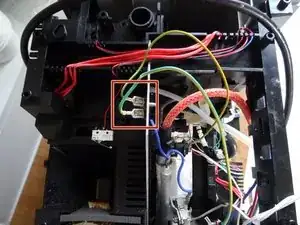 Нагреватель подключён к питанию синим и коричневым проводами. Оба провода подключены к тепловым предохранителям плоскими клеммами.