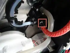 Снимите силиконовый шланг, который ведёт к соединению воды в резервуаре, изнутри.