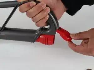Установив пылесос в вертикальное положение, сильно нажмите на серую кнопку, расположенную на задней стороне ручки, и тяните прямо вверх, пока ручка полностью не снимется с остальной части пылесоса.