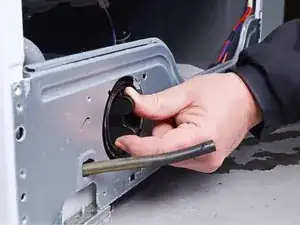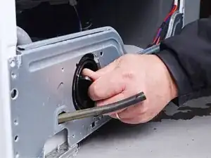 Вытащите защёлку дверцы через её отверстие в шасси и дайте ей свободно повиснуть на проводе.