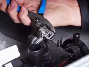 Используйте водяные плоскогубцы, чтобы прокручивать выпускной шланг насоса взад-вперёд вокруг соединения и ослабить его.