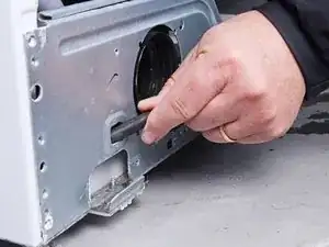 Используйте крестовую отвертку, чтобы извлечь два винта длиной 26,3 мм, крепящие дозатор для моющих средств.