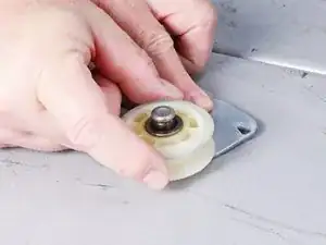 Используйте длинногубцы, чтобы снять пластиковый стопорный фиксатор с паза вала натяжного ролика.