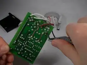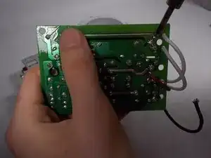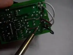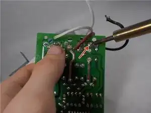Наконец, на нижней части платы нагрейте паяное соединение чёрного провода. Пока припой расплавлен, удалите провод из соединения.