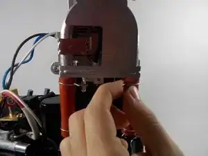 Найдите верхние две пружинные скобы на трубке, прикреплённой к нагревательному блоку. Сожмите эти зажимы, одновременно потянув вниз, чтобы освободить трубку от блока. Клещи облегчат эту операцию.