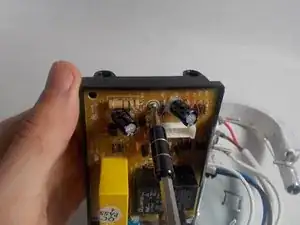 Используя биту PH1, снимите два винта длиной 0,425 дюйма, крепящие белый держатель сетевого провода. Это даст необходимый запас провода для работы с платой.