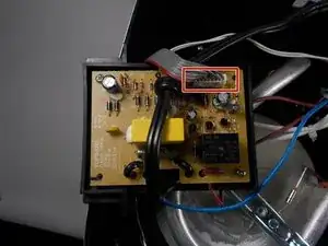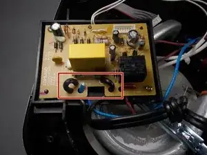 С лицевой стороной, повернутой к вам и перевёрнутым устройством, в верхнем левом углу круговой нагревательной пластины находится бежевый печатный модуль с двумя винтами по бокам, удерживающими его. Отвинтите их.