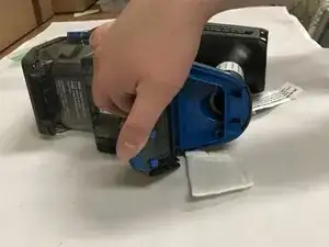 Нажмите на синий рычаг, расположенный в нижней части ручки, и потяните пластиковую крышку от основного пылесоса.