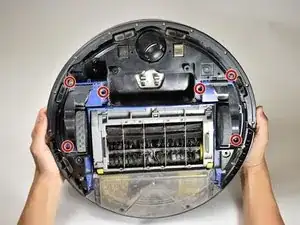 Переверните Roomba так, чтобы колеса были обращены вверх, а контейнер для пыли был ближе к вам.