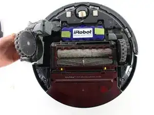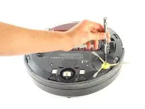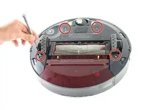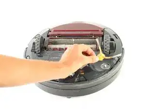 Перевернув Roomba, открутите винт 4.0mm, находящийся рядом с боковой щеткой, с помощью отвертки Phillips #2.
