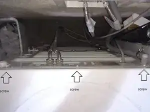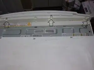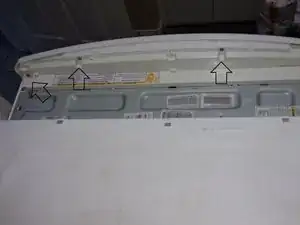 На фото вид сверху стиральной машины. Снимите три винта, удерживающие изогнутую пластиковую панель.
