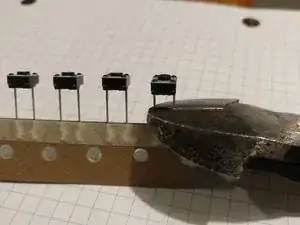 После удаления старого переключателя отрежьте один из новых переключателей (первое изображение) и сравните их. Оставьте достаточную длину выводов. Вы всегда можете обрезать их короче после пайки. Убедитесь, что он входит в отверстие и что кнопка примерно такой же высоты, как у старого переключателя.