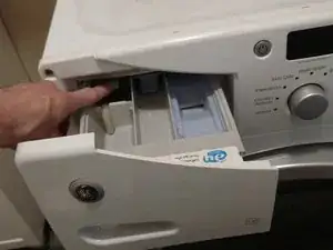 Выдвиньте лоток для моющих средств и аккуратно надавите на защёлку, выдвигая его.