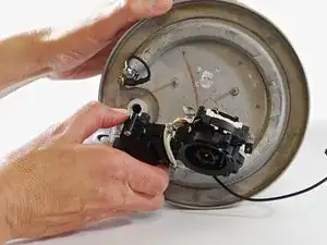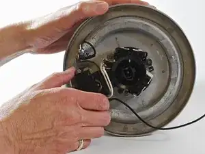 Снимите блок питания. Разместите чайник, как показано, ручка должна быть справа. Снимите гайку 7/32" со штыря, который расположен по часовой стрелке от места, где был прикреплён блок питания, с помощью головки 7/32".