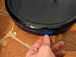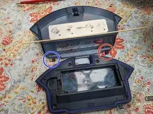 Вы, вероятно, уже достали контейнер, чтобы заметить, что петля сломана. Если, однако, кто-то просто представил устройство для ремонта, снимите контейнер, сжимая синюю защелку на заднем крае RoboVac и вытаскивая контейнер из корпуса RoboVac.