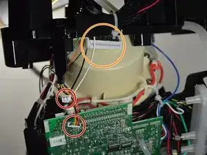 Пучок с черными проводами и одним красным проводом подключён к самой верхней части платы. Чтобы снять эти провода, сожмите белые защёлки, вытягивая их.