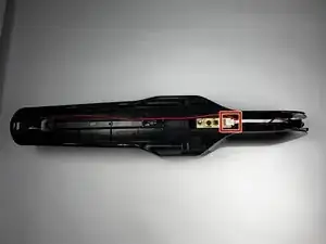 Подведите инструмент iFixit под корпус вдоль корпуса пылесоса до снятия оболочки, начиная примерно от порта для присоединения и скользя вниз в сторону порта зарядки.