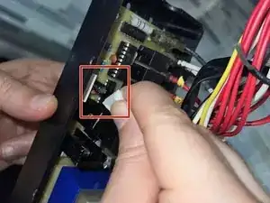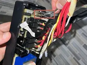 Оттяните десятиконтактный кабель с белым разъёмом, расположенный слева от платы.