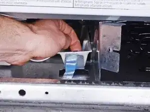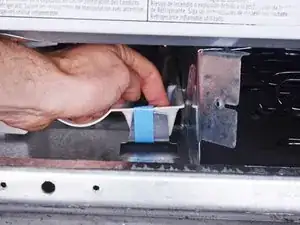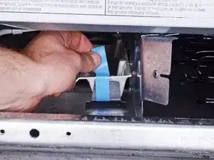 Снимите ленту со передней металлической защёлки, прикреплённой к поддону для слива.
