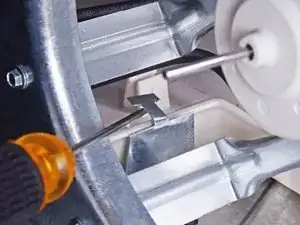 Используйте плоскую отвёртку или похожий инструмент, чтобы приподнять металлическую защёлку на задней части поддона для слива.