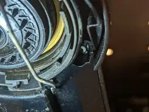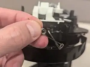 Снимите серебристую пружину освобождения крышки: снимите один конец с белого держателя кнопки, затем снимите другой конец с чёрного механизма освобождения крышки. Для этого могут пригодиться пинцет или зубочистка.