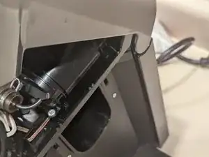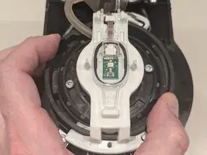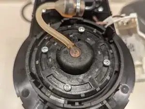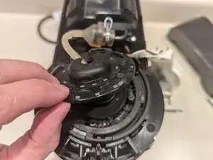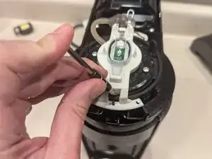 Белый держатель останется подключённым к машине тонким коричневым проводом. Аккуратно поверните белый держатель вокруг и вправо, чтобы освободить место для дальнейшей разборки головки машины.