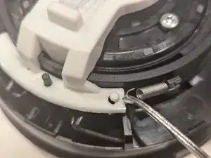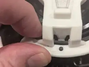 Снимите белый держатель кнопки с верхней части головки машины: небольшая плоская отвёртка поможет осторожно нажать на каждый из двух пластиковых зажимов, чтобы ослабить и поднять его.