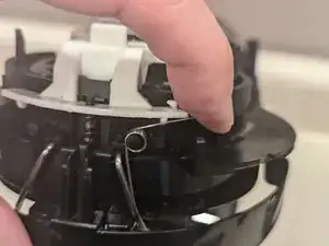 Возможно, будет проще сначала зацепить один конец пружины за чёрный фиксатор крышки, а затем с помощью пинцета или зубочистки растянуть другой конец пружины и надеть его на выступ белой монтажной скобы кнопки.