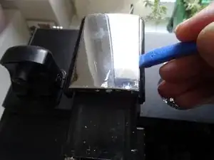 Подденьте пластиковой лопаткой по нижнему краю хромированной крышки, чтобы приподнять носик раздачи кофе. Эта крышка часто сидит очень плотно, придётся поддевать сильно и надеяться, что деталь не сломается.