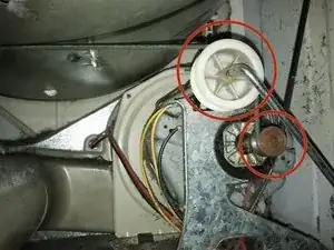 Внутри двери вы увидите приводной ремень, обвитый вокруг шкива мотора и натяжителя. Дотянитесь внутрь устройства, надавите вниз на рычаг натяжителя и отсоедините ремень. Будьте осторожны, чтобы не порезаться: вокруг много острых металлических краев.
