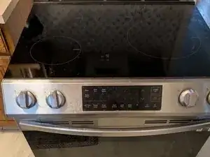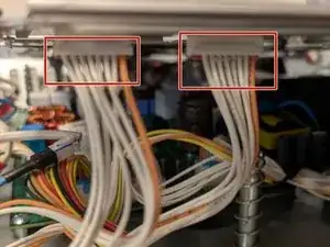 Разъёмы, подключённые к печатной плате сзади и к панели управления спереди, всё ещё соединены. Аккуратно поднимите варочную панель, пока не станут доступны винты слева и справа.