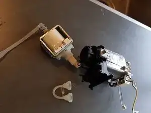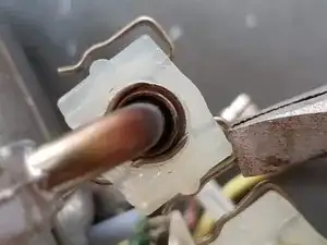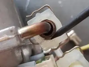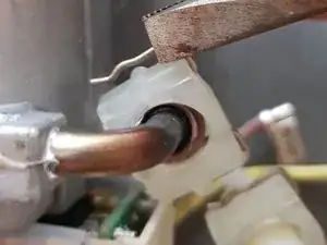 Эти защёлки трудно снять. Пластиковые прямоугольники, в которых размещены проволочные зажимы, являются частью U-образной трубки. Имейте это в виду при отсоединении U-образной трубки от двух других трубок (насоса и бойлера) — у них конические фланцы; на них легко надеть плоские торцы U-трубки, но трудно снять.