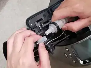 Снимите трубку прокалывающего игольчатого клапана с трубки Keurig, потянув их в разные стороны двумя руками.