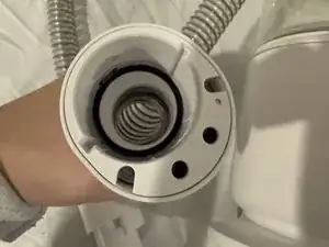Возьмите заменяющий проводной шланг и выровняйте его с соединительным разъёмом пылесоса. Убедитесь, что концы совпадают с концами соединённого шланга пылесоса. Установите концы в ориентации с пылесосом. Нажмите или поверните шланг в нужное положение, пока он не зафиксируется или не щёлкнет на месте.