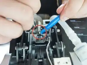 Используя пинцет и пластиковый инструмент для открытия, захватите переднюю часть пружины, чтобы снять ее.