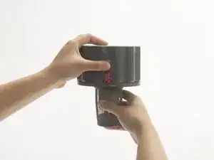 Нажмите вниз на чёрную резиновую кнопку, расположенную сверху пылесоса.