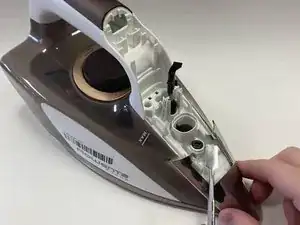 Вставьте металлическую лопатку в зазор между деталью кнопки распыления/пара и остальной частью утюга.