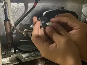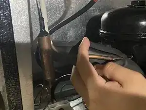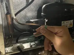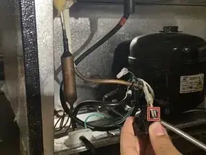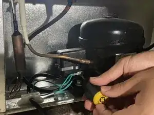 С помощью плоской отвёртки отожмите белый кабель от реле компрессора, чтобы отсоединить его.