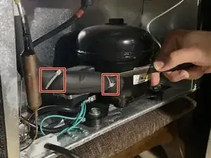 Вставьте плоскую отвёртку между реле компрессора и основанием.