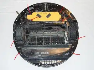 Верхний корпус удерживается на месте восемью винтами Phillips #2 на нижней стороне устройства. Удаление четырех винтов вокруг отсека для батареи - самый сложный шаг в обслуживании робота.