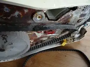 Новый ремень укладывается. Сначала на малое приводное колесо, затем на большое приводное колесо, сидит с одной стороны и вращается один раз.