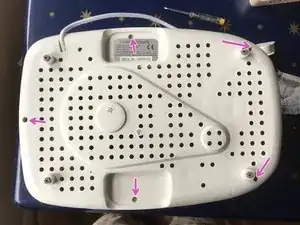 Переверните хлебопечку вверх дном и отвинтите 5 винтов в основании (розовые стрелки). Некоторые из этих винтов, вероятно, противовскрывающие. Если у вас нет бит для противовскрывающих винтов, возможно, потребуется, например, сделать вырез в плоской отвёртке (или обратиться в местное ремонтное кафе за помощью).