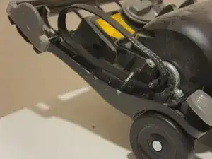 Нажмите на серую кнопку разблокировки, расположенную между двумя задними колесами, чтобы опустить ручку до пола.