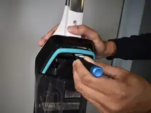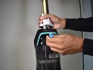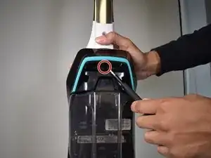 В этом руководстве кнопка ручки находится на задней части пылесоса в Шаге 1. Эта кнопка необходима для снятия ручки, а также для слышимого щелчка при её установке. Диаметр отверстия для кнопки составляет 8 мм; следовательно, любой инструмент меньшего размера сможет освободить ручку.