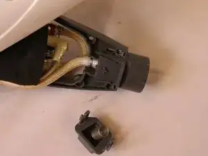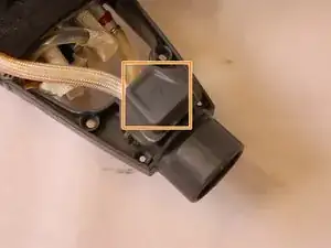 Начните с удаления двух винтов с головкой Philips размером 6,35 мм, изображенных на фото. Эти винты фиксируют нижнюю часть сборки кнопки к средней раме швабры.