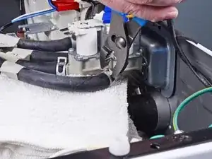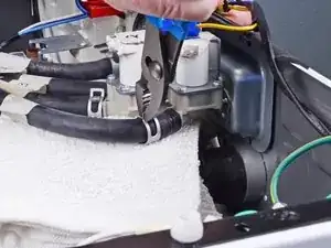 Используйте плоскогубцы для сдвига хомута шланга входного клапана и потяните его от сборки входного клапана.