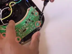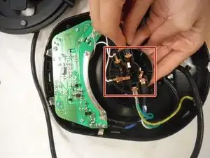 Отключите пять металлических разъёмов, прикреплённых к центральному кругу — три провода от печатной платы и два провода от сетевого шнура.